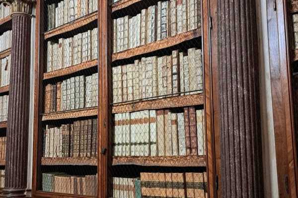 The original furnishings and frescoed vaulted ceiling form the oldest part of the library, which houses around 10,000 antique volumes.
