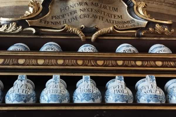 The original furnishings and frescoed vaulted ceiling form the oldest part of the library, which houses around 10,000 antique volumes.